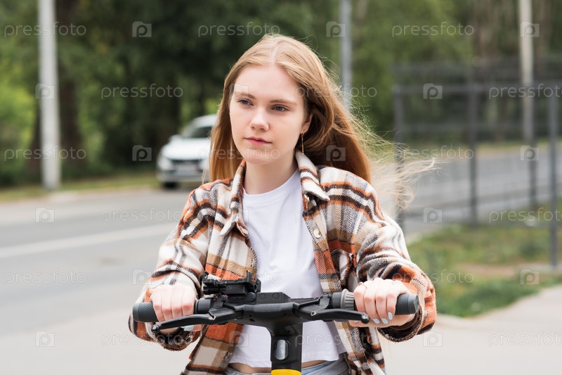 Молодая женщина на электросамокате едет по улице