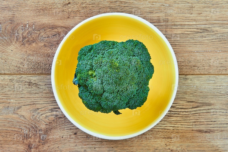 Зеленое соцветие брокколи на желтой тарелке на деревянном столе