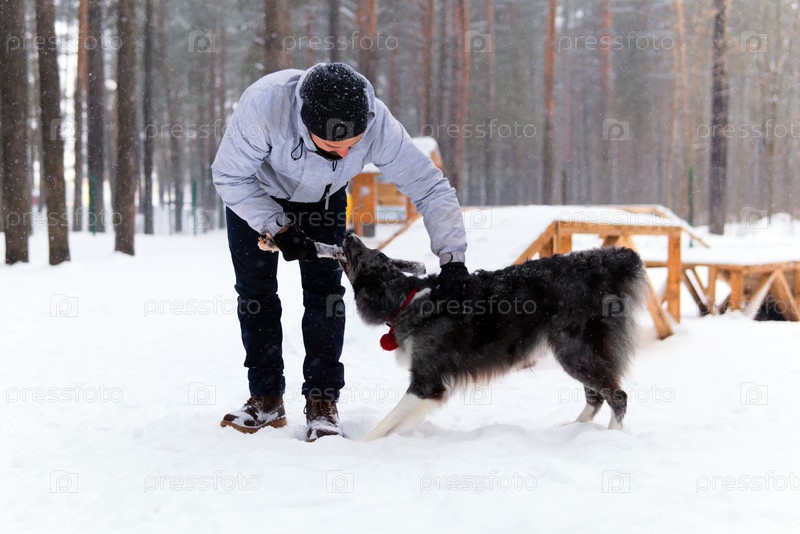 Молодой человек играет с собакой в собачьем парке в зимнем лесу