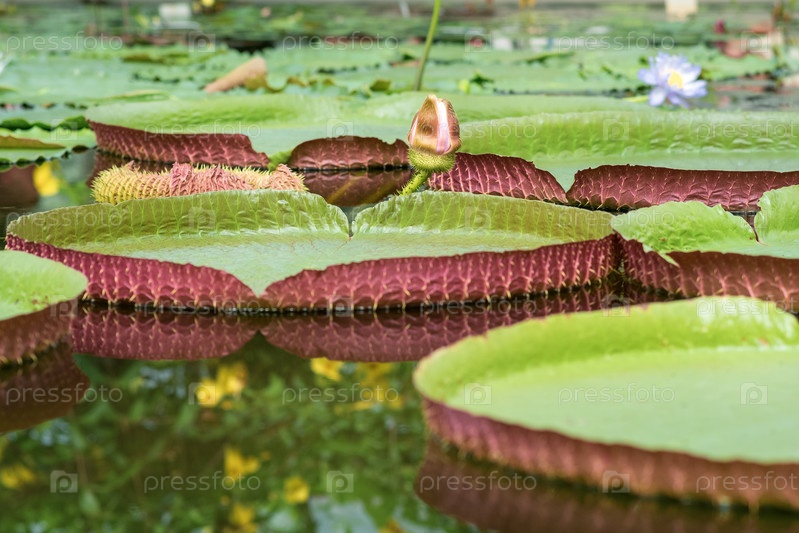 Плавающие листья и цветущий бутон гигантской кувшинки Виктория амазонская
