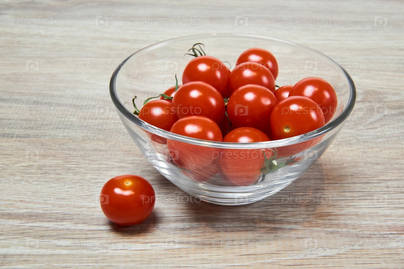 Помидоры черри в стеклянной миске и еще один рядом, на поверхности деревянного стола