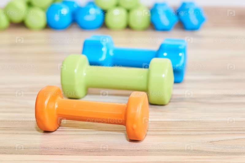 На полу лежат три небольшие прорезиненные гантели разного веса