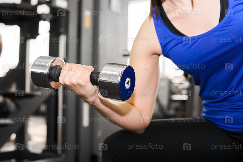 Рука женщины, выполняющей упражнения с гантелями в тренажерном зале
