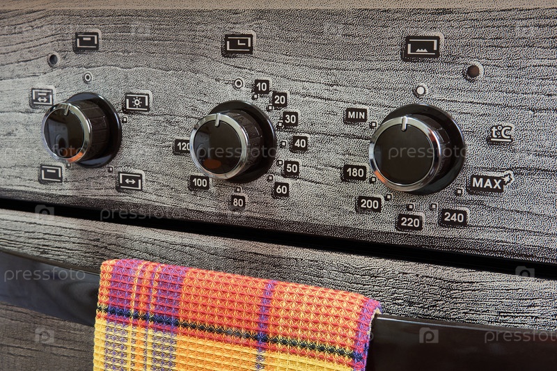 Фрагмент лицевой панели бытовой газовой кухонной плиты с переключателями