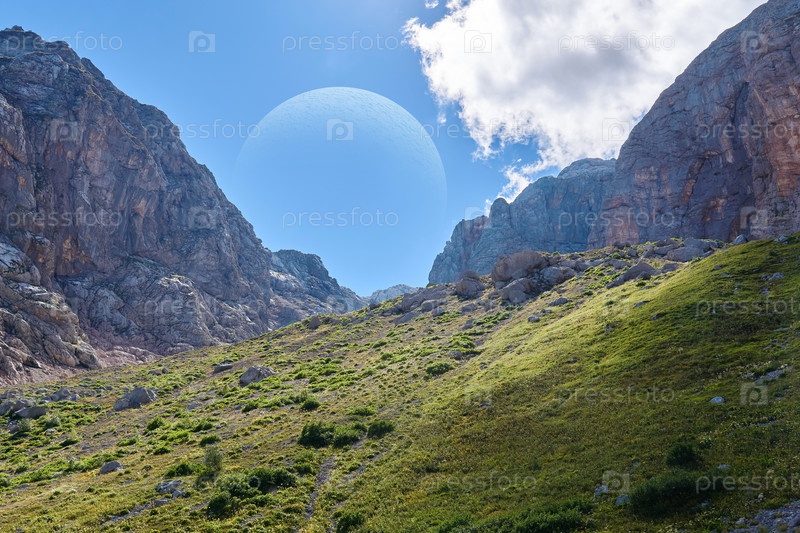 Вымышленный пейзаж какой-то похожей на Землю экзопланеты с огромным спутником в небе