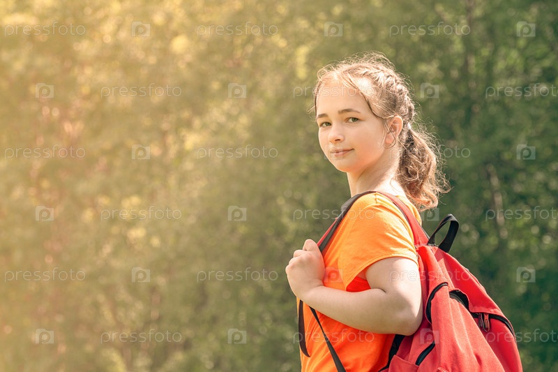 Девушка-подросток в яркой футболке с рюкзаком гуляет на природе