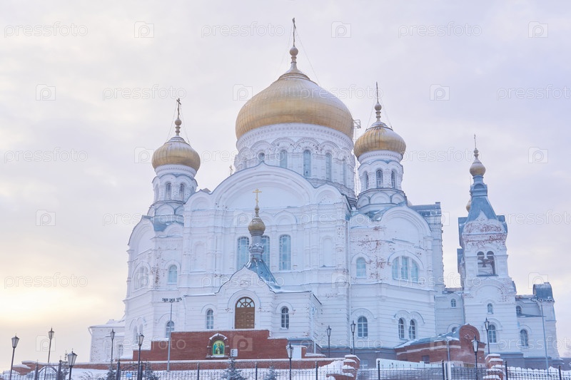 Храм Белогорского женского монастыря в Пермском крае, Россия, в туманный зимний день