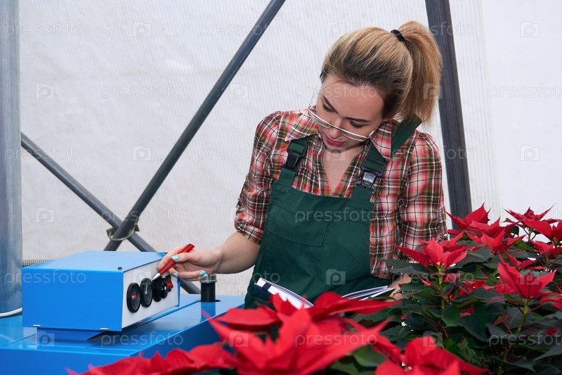 Женщина-агроинженер проверяет отопительное оборудование в питомнике тепличных растений