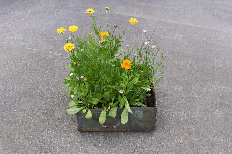 Небольшой железный ящик с полевыми цветами стоит на бетоне