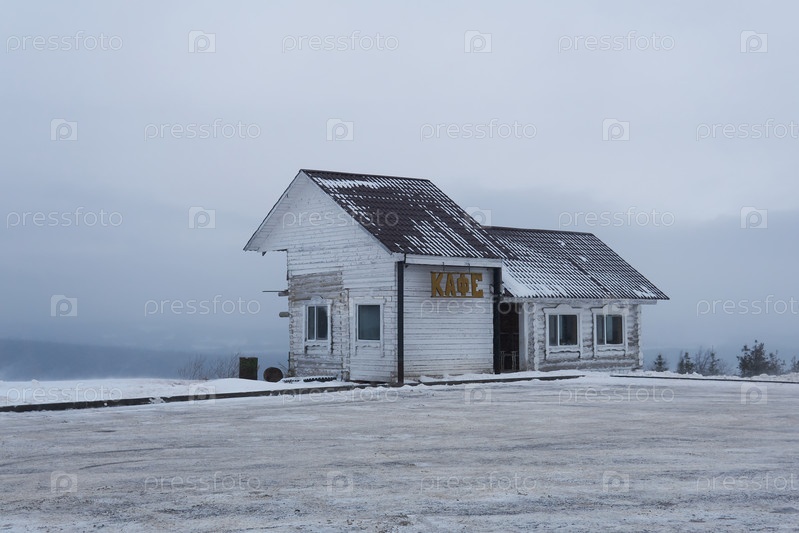 Старое деревянное здание транспортного кафе на горном перевале в заснеженном зимнем пейзаже в Пермском крае, Россия
