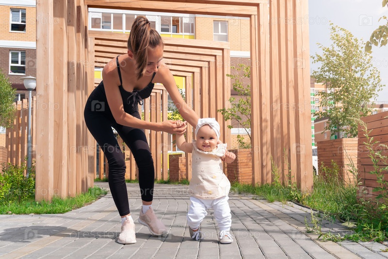 Молодая женщина и ее маленькая дочь гуляют по городскому двору, ребенок учится ходить