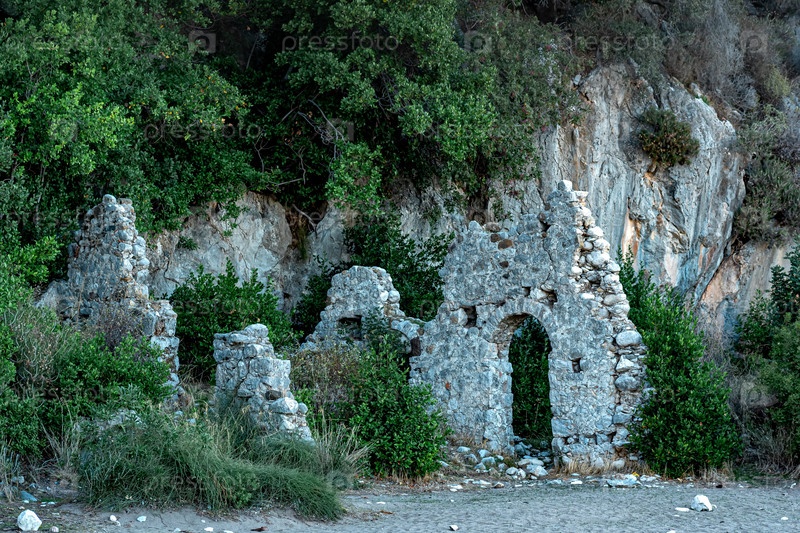 Руины древнего здания на фоне гор в античном городе Олимпос, Турция