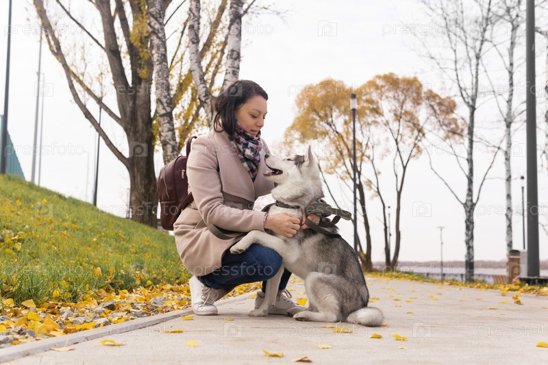 Молодая женщина общается со своей хаски-собакой в осеннем парке