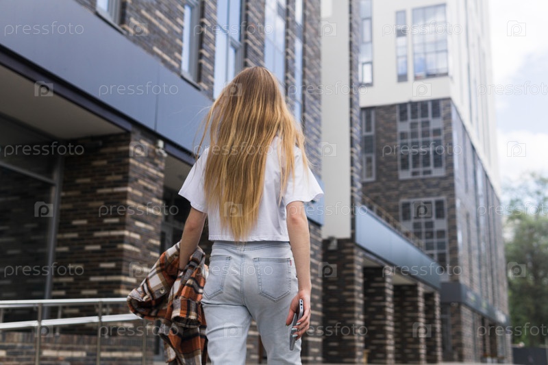 Молодая женщина идет по улице, вид сзади