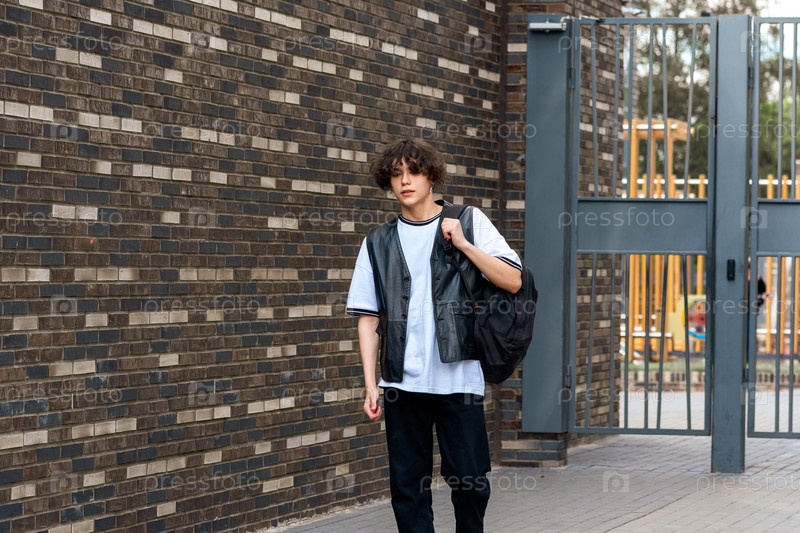 Молодой человек на улице на фоне городского двора