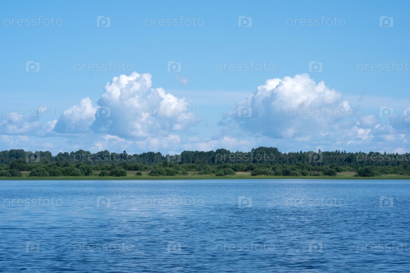 Водный пейзаж, лесистый берег озера, вид с воды в солнечный день