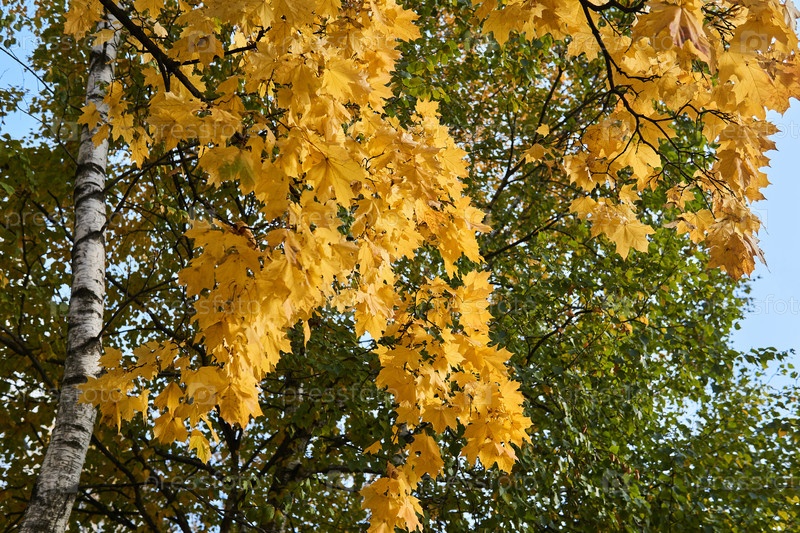 Желтая и зеленая осенняя листва, кроны деревьев
