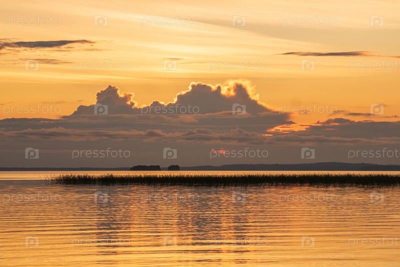 Природный ландшафт, белая ночь над широким северным озером