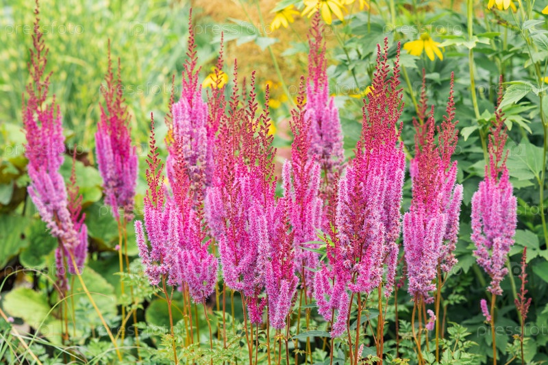Фиолетово-красные цветы астильбы на открытом воздухе на размытом естественном фоне