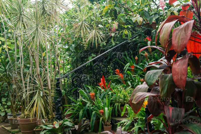 Цветущие бромелии в горшках на ступеньках старинной лестницы среди тропических растений в старой теплице