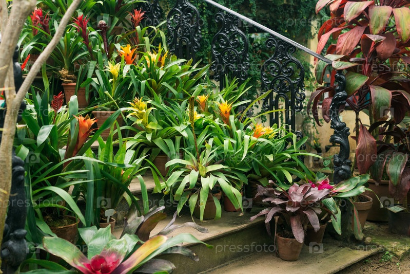Цветущие бромелии в горшках на ступеньках старинной лестницы среди тропических растений в старой теплице