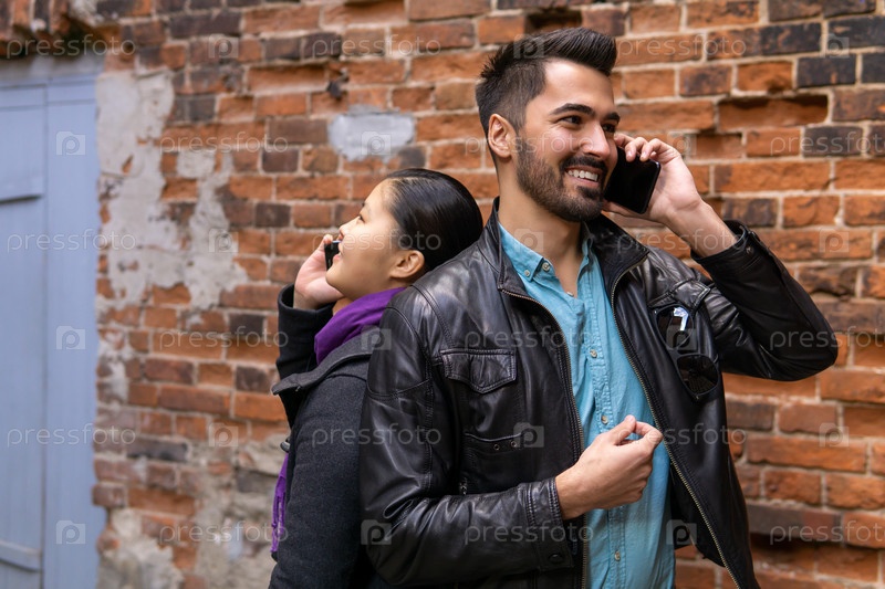 Молодой мужчина и женщина стоят рядом спиной к спине и разговаривают по мобильным телефонам