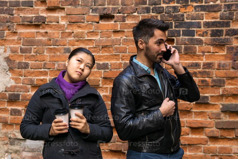 Молодой человек разговаривает по телефону, девушка скучает по двум бумажным стаканчикам кофе