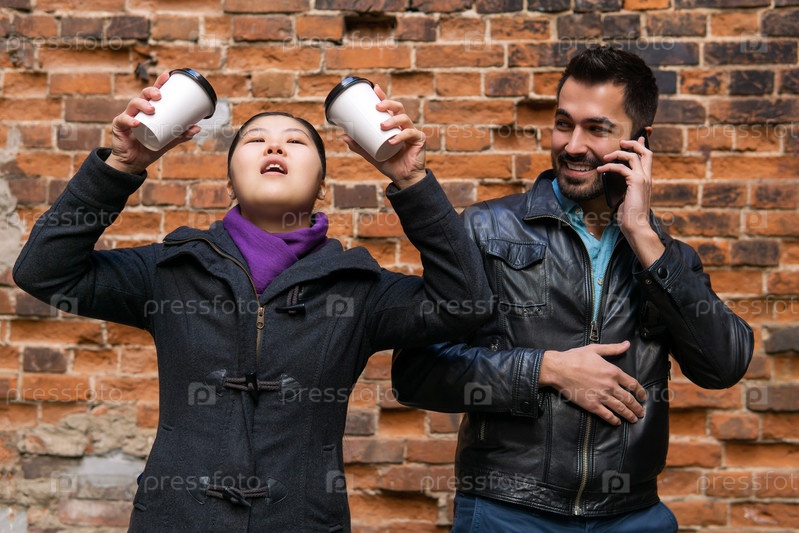 Молодой человек долго разговаривает по телефону, девушка нетерпеливо пародирует его