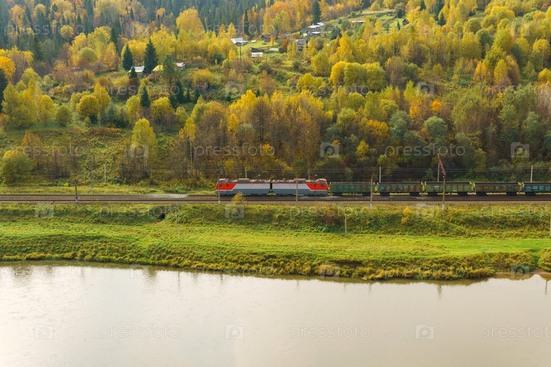 Пейзаж осенней долины реки между холмами с железной дорогой