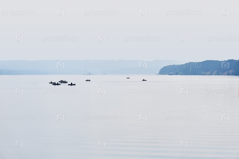 Рыбаки на надувных лодках ловят рыбу на широкой реке в утреннем тумане