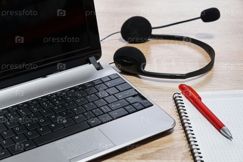 Ноутбук, наушники, блокнот и ручка на столе крупным планом
