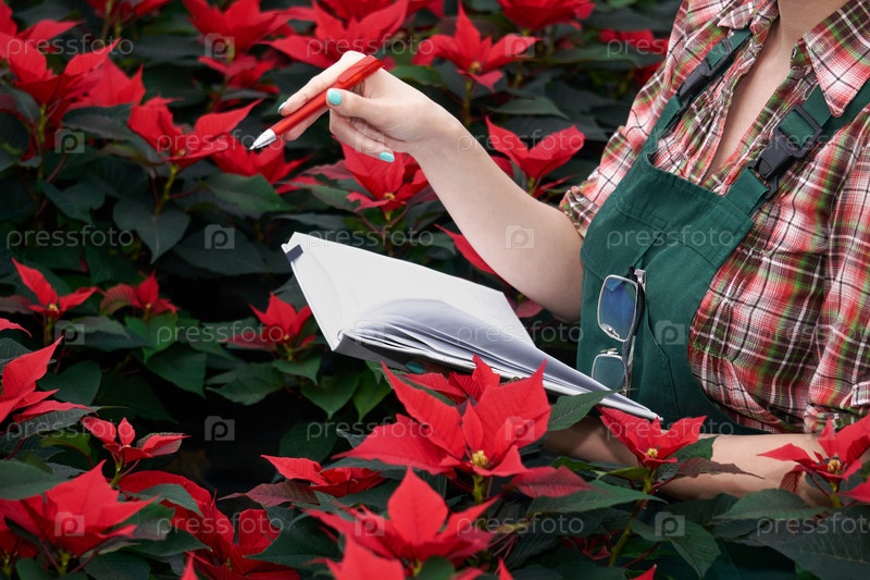 Руки женщины-агронома записывают рост пуансеттии в бумажном блокноте в питомнике растений