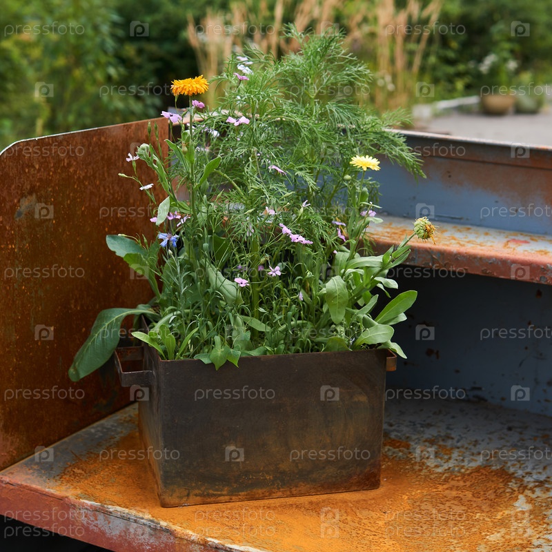 Небольшой железный ящик с полевыми цветами стоит на ржавой железной конструкции