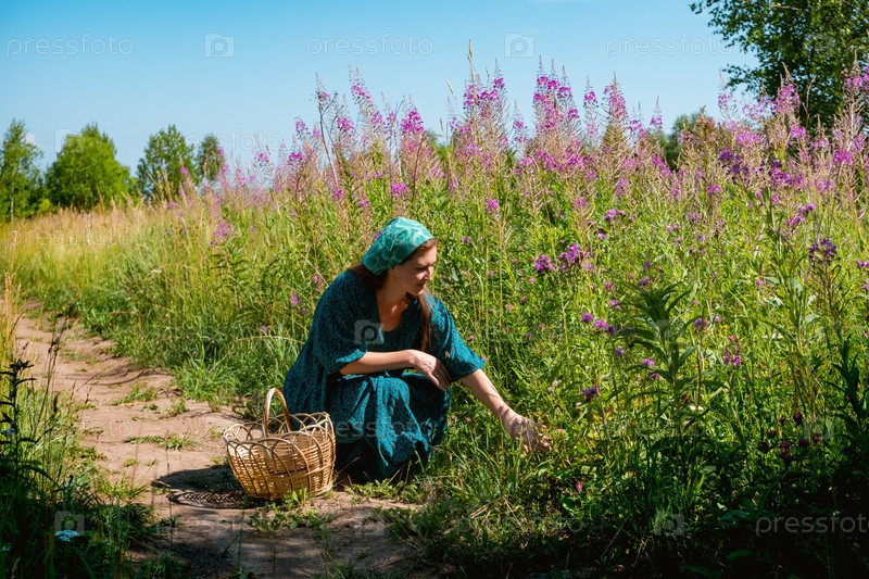 Молодая женщина в народной крестьянской одежде, дикие растения, ягоды или грибы на лугу