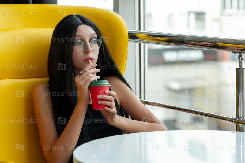 Девушка-подросток пьет коктейль в кафетерии и о чем-то думает