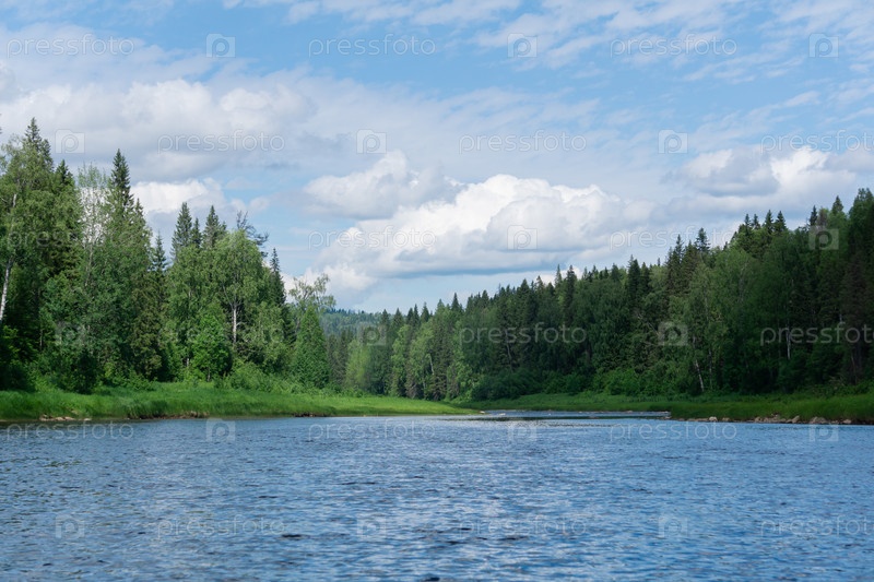Красивый пейзаж летней реки с лесистыми берегами