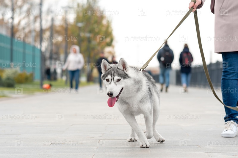 Собака хаски гуляет с хозяином на свежем воздухе в осенний день