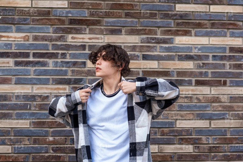 Молодой человек позирует у кирпичной стены