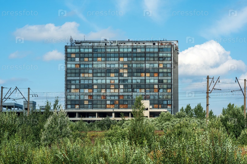 Пейзаж окраины промышленного города со старой заводской мастерской за железной дорогой