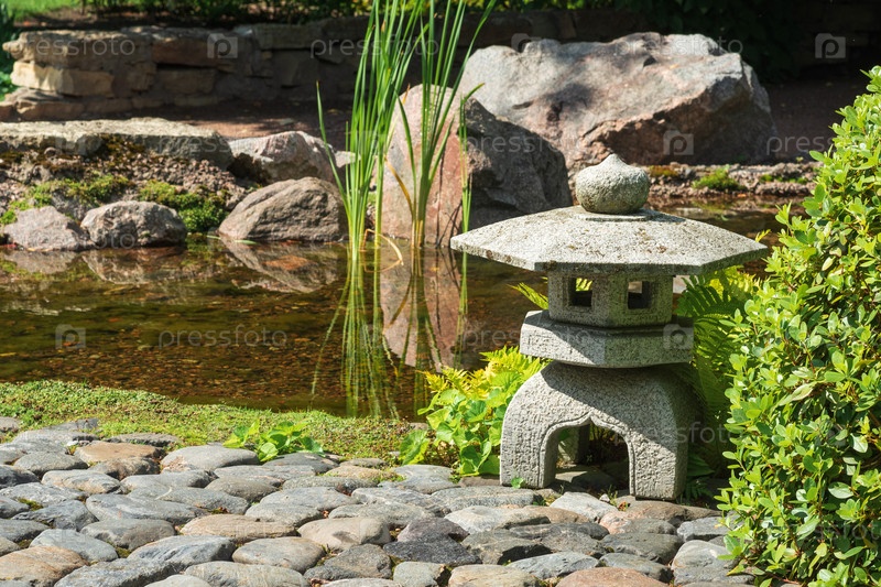 Каменный фонарь на берегу пруда в японском саду