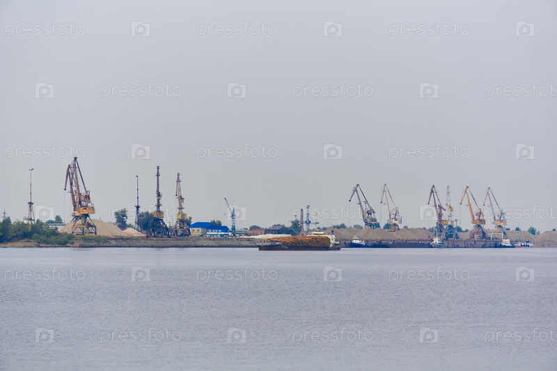 Промышленный речной водный пейзаж с лесным грузовым судном и грузовым терминалом