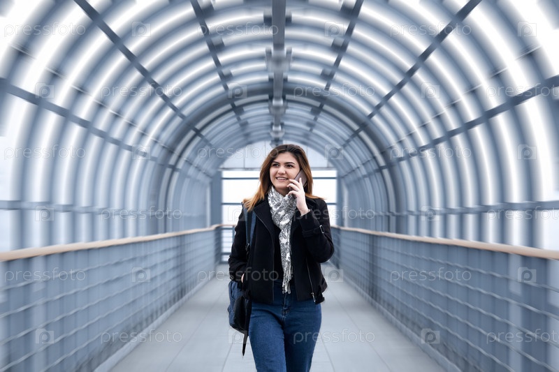 Молодая женщина быстро идет по крытому пешеходному переходу, разговаривает по телефону