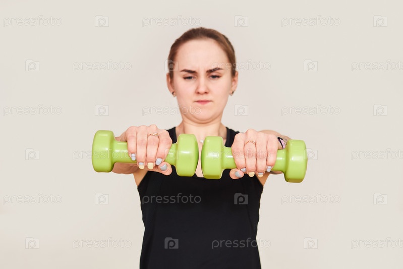 Молодая женщина выполняет упражнения с гантелями, держа их перед собой с видимым усилием