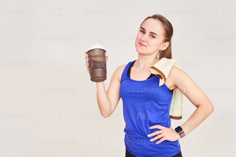 Молодая спортивная женщина с полотенцем и шейкером для спортивного напитка после тренировки