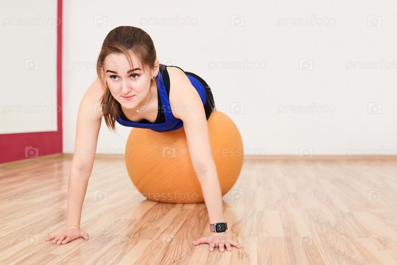 Молодая женщина тренируется, отжимаясь с мячом для упражнений в тренажерном зале