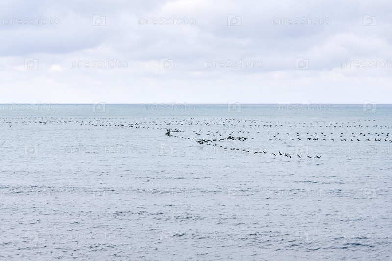 Морской пейзаж со стаей перелетных птиц, низко летающих над водой