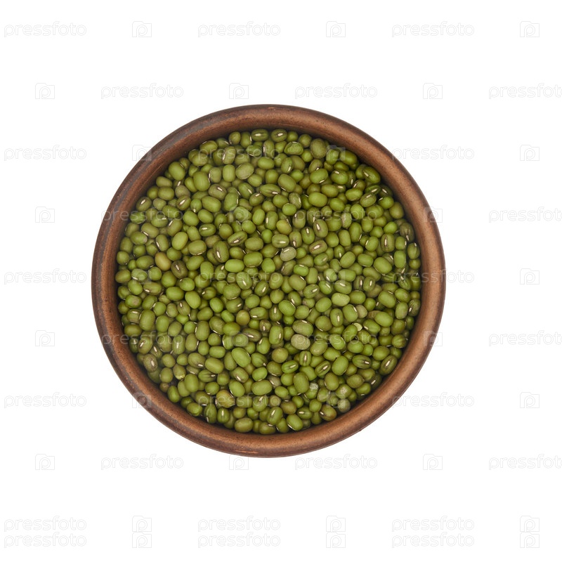 Фасоль мунг в глиняной миске на белом фоне, вид сверху