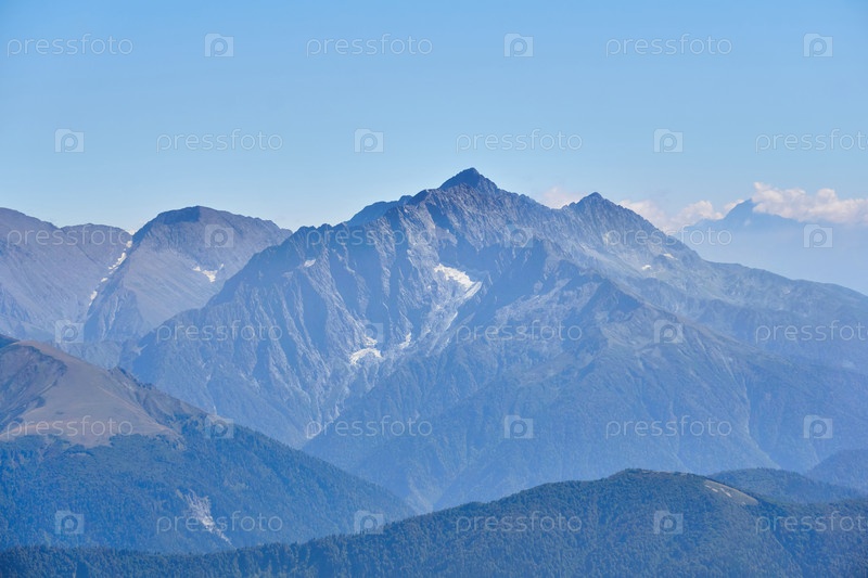 Вид с высоты горных вершин с ледниками в голубой атмосферной дымке
