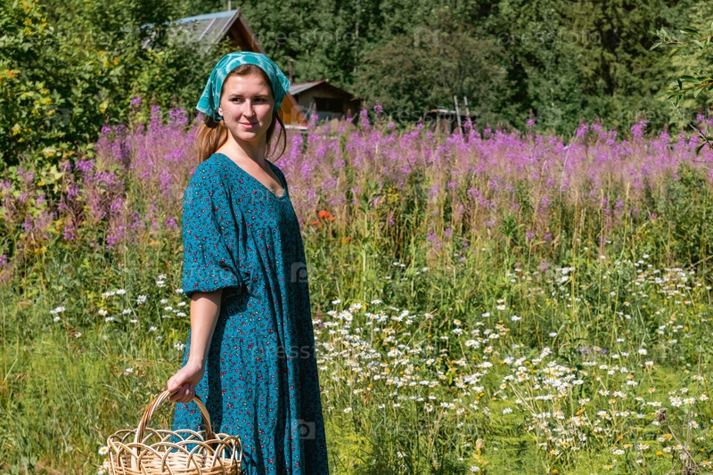 Молодая женщина в народной крестьянской одежде на фоне цветущего луга и сельских построек