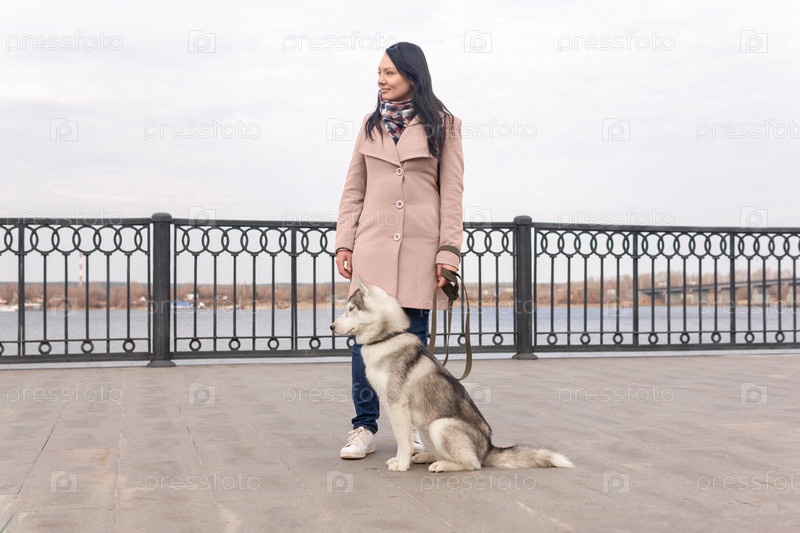 Молодая женщина с хаски-собакой гуляет по городской набережной в осенний день